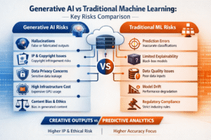 Generative AI and traditional machine learning (ML) share foundational principles, but their risk profiles differ significantly in scope, impact, and