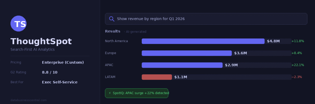 ThoughtSpot reimagines enterprise analytics as a Google-like search experience. Type a business question in natural language and receive an instant AI-generated visualization — no SQL, no dashboard configuration, no waiting. SpotIQ automatically detects patterns and anomalies in the background, surfacing unexpected insights before you think to ask. Rated 8.8/10 by enterprise users in 2026, ThoughtSpot also leads for embedded analytics through ThoughtSpot Everywhere, enabling product teams to integrate conversational BI directly into customer-facing applications via APIs. A clean data model is the prerequisite; messy warehouses will frustrate the search engine.