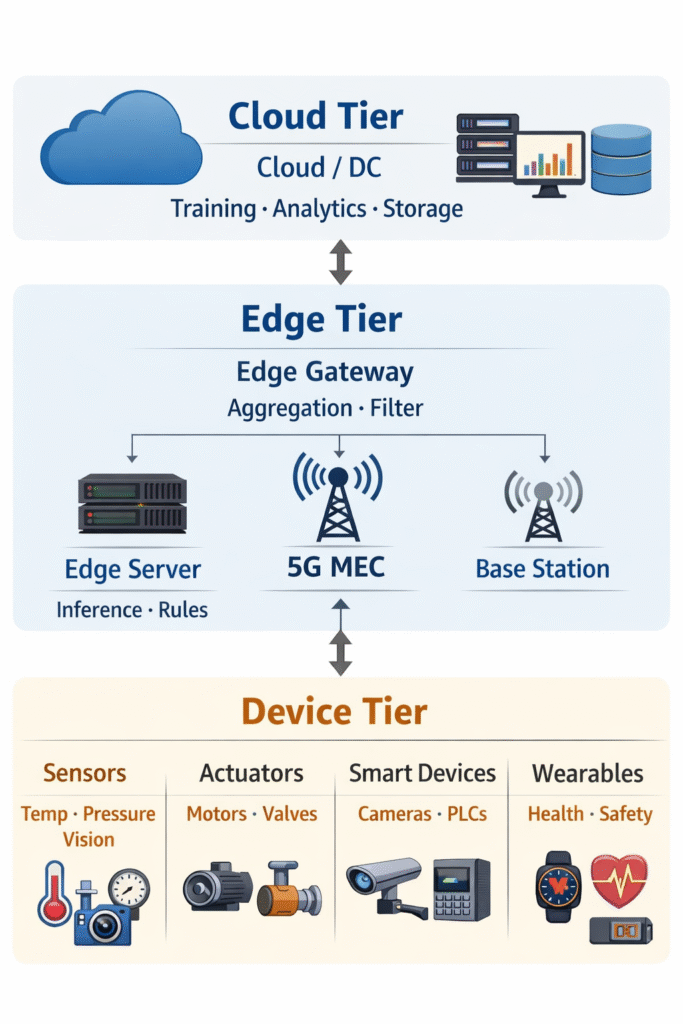 A typical edge deployment follows a three-tier hierarchy: devices at the bottom, edge nodes in the middle, and cloud at the top.