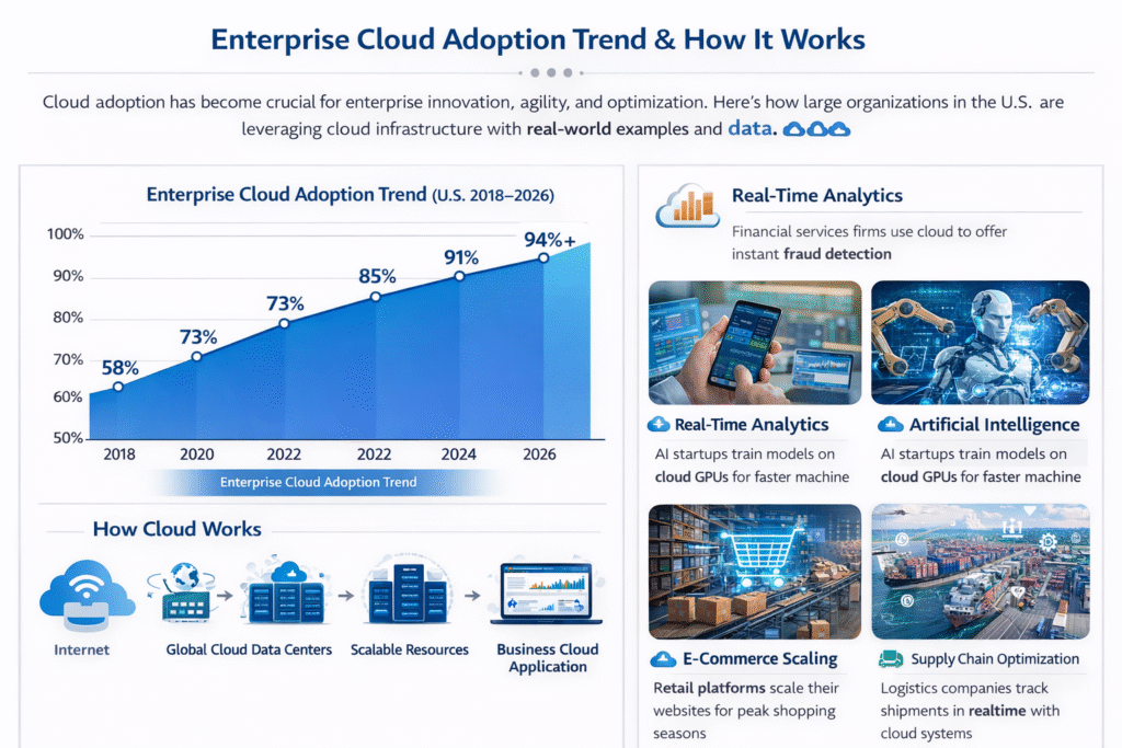 The adoption curve from 58% in 2018 to 94%+ projected by 2026 illustrates structural transformation across U.S. industries. Cloud now powers AI innovation, blockchain deployment, SaaS ecosystems, fintech transactions, and real-time analytics engines.