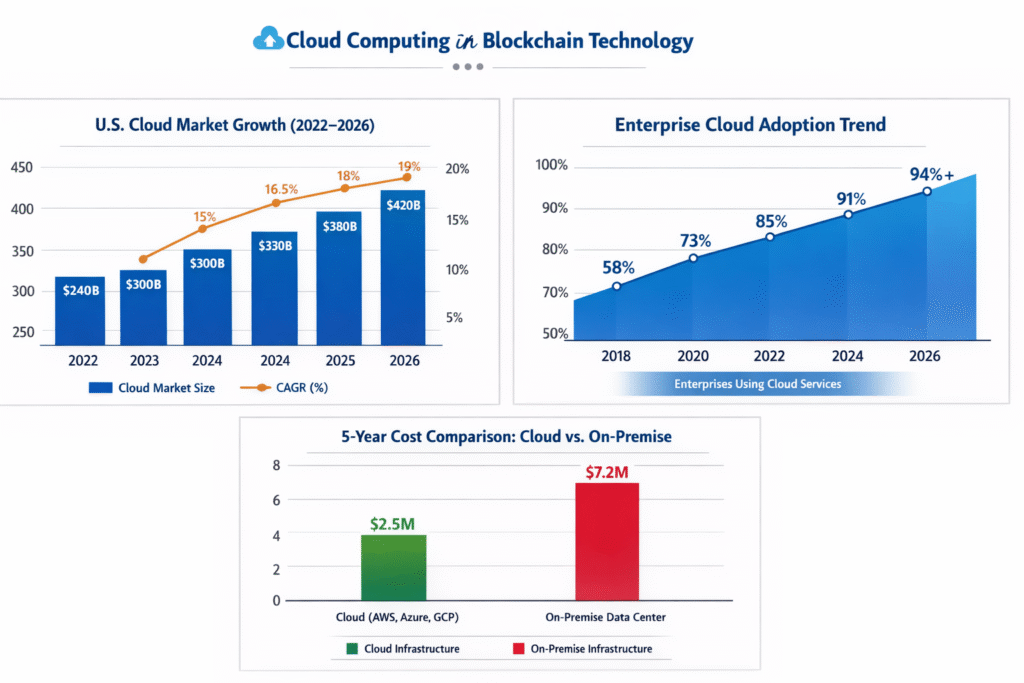 In 2026, the convergence of cloud computing and blockchain technology is reshaping enterprise architecture across the United States. The U.S. cloud computing market is projected to exceed $400 billion in annual spending, while the blockchain market is expected to surpass $65 billion domestically within the next few years. More than 90% of U.S. enterprises now rely on cloud infrastructure, and a growing percentage of blockchain deployments are running on public cloud platforms rather than self-hosted nodes.