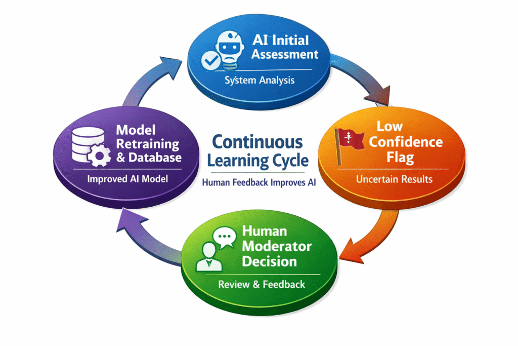 The human moderator’s decision is then fed back into the system, continuously enriching the model’s understanding of local context.