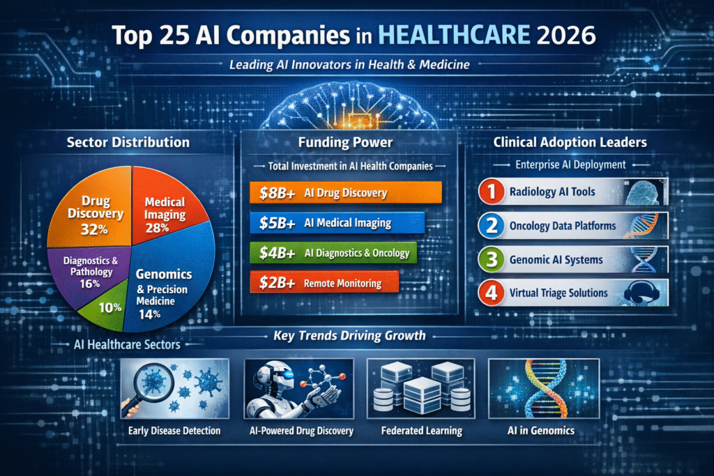 Artificial Intelligence is now embedded in clinical workflows, pharmaceutical research, and hospital operations. AI-driven diagnostics, predictive analytics, and automated drug discovery platforms are reducing costs, accelerating research timelines, and improving patient outcomes. The companies listed below are ranked based on innovation impact, funding strength, regulatory progress, enterprise adoption, and scalability.